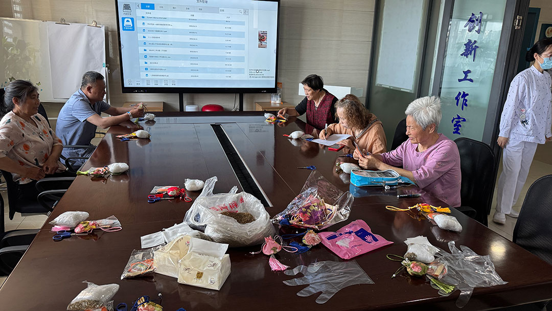 为了让患者体验动手的乐趣,我们特意准备了柿子造型的香囊材料包。“柿子”谐音“事事”,寓意平安顺遂。在我们团队的耐心指导下,患者们一针一线缝制香囊,护士们也俯身帮忙穿针引线。